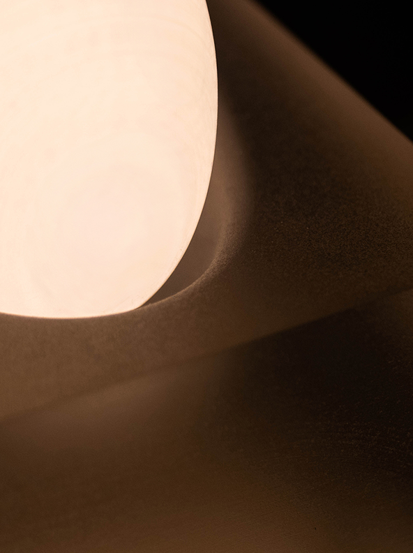 The Floating Island is a table lamp that stands out by the softness of its lampshades and the hardness of its base. The light emanates evenly from the lampshade, gently diffusing into the translucent base, elegantly creating a contrast of two lighting effects.