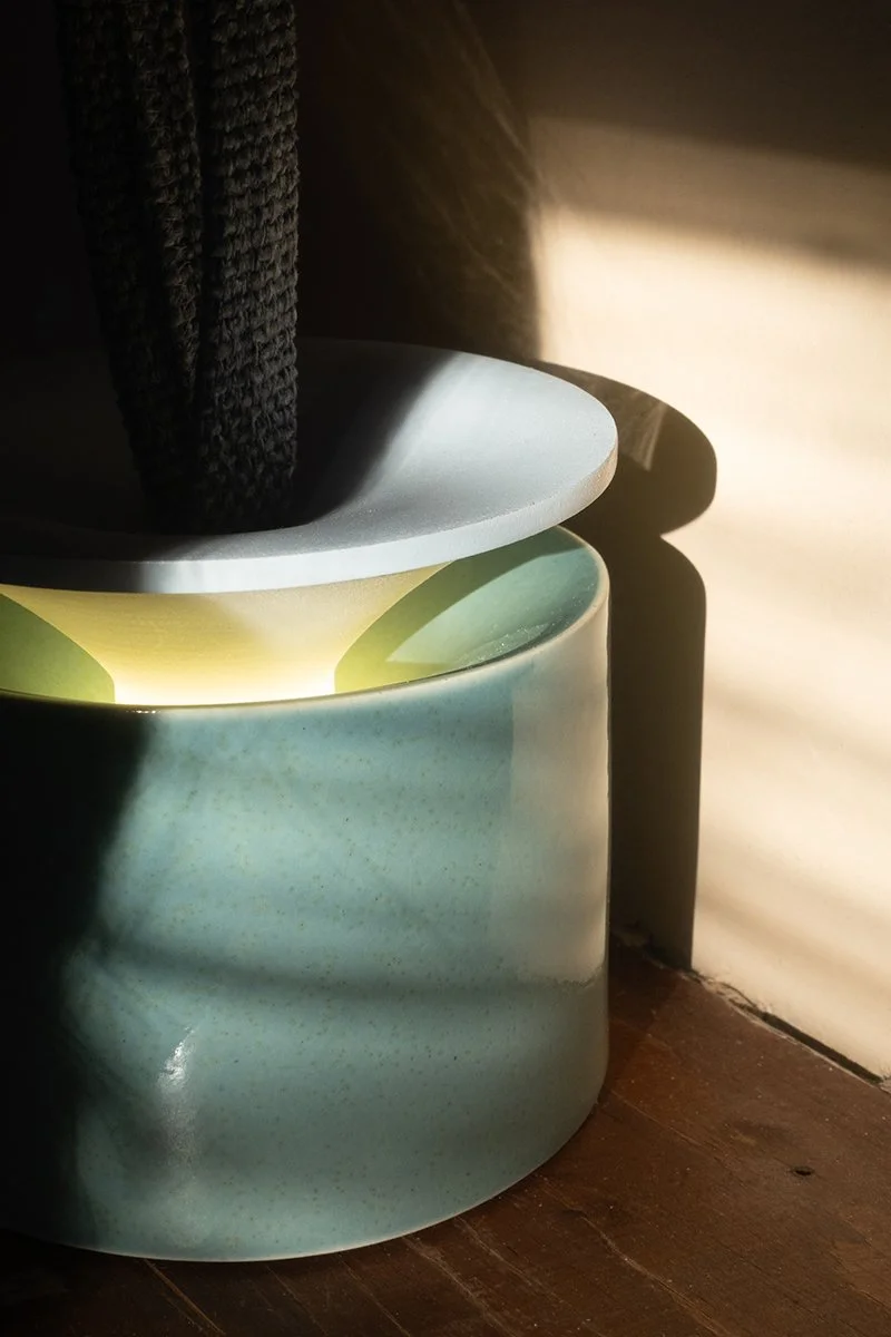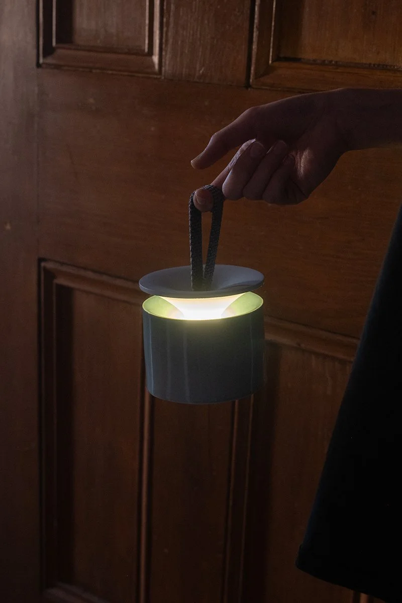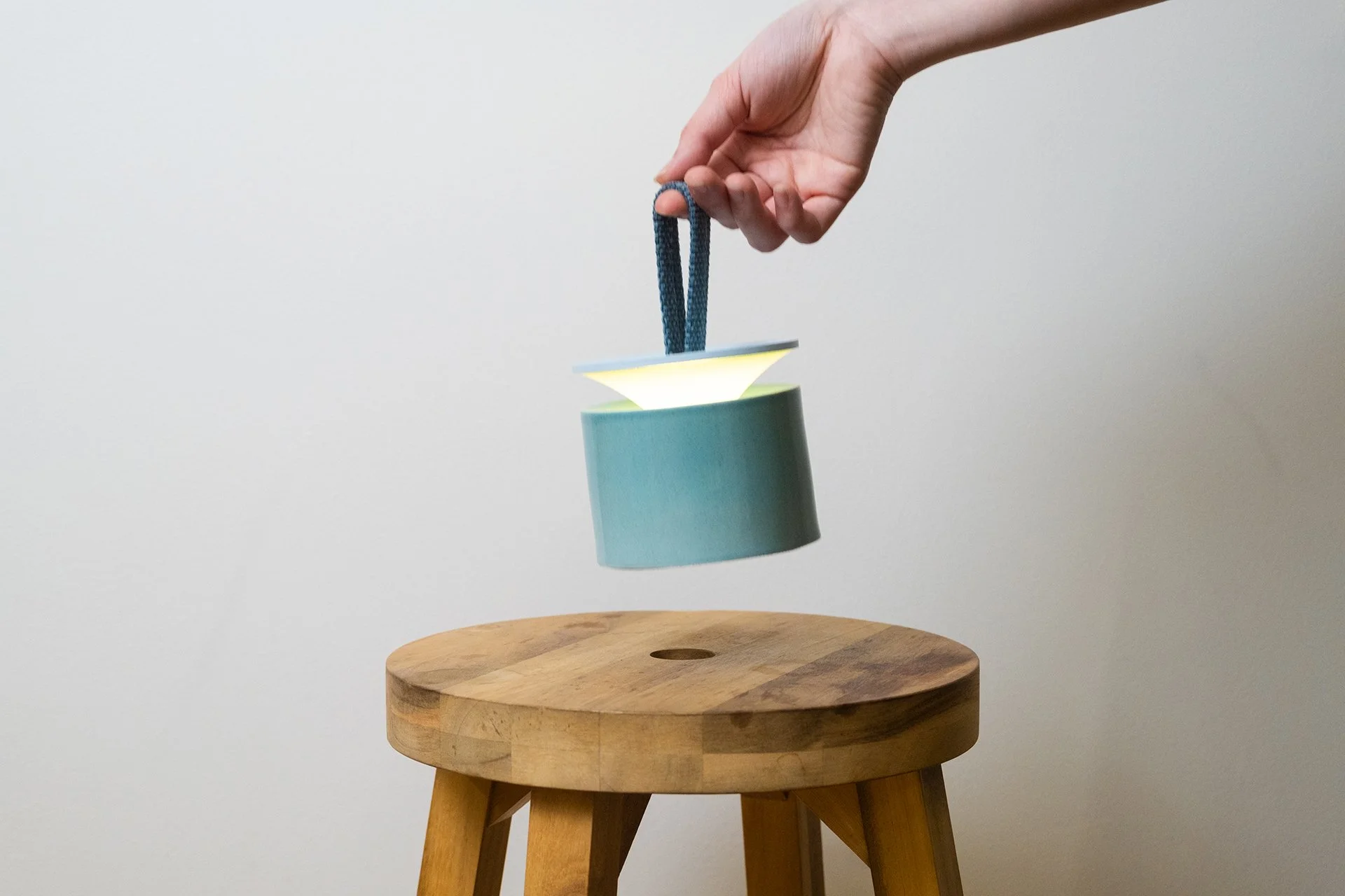 Rise is a gentle portable lamp that lights up when lifted by hand. Hung by a soft felt loop, it responds to your touch as it gently brightens while rising, casting a warm glow that reflects softly off the ceramic surface. When placed back down, the light quietly fades. Rise turns the simple act of lifting into a calming ritual of illumination.